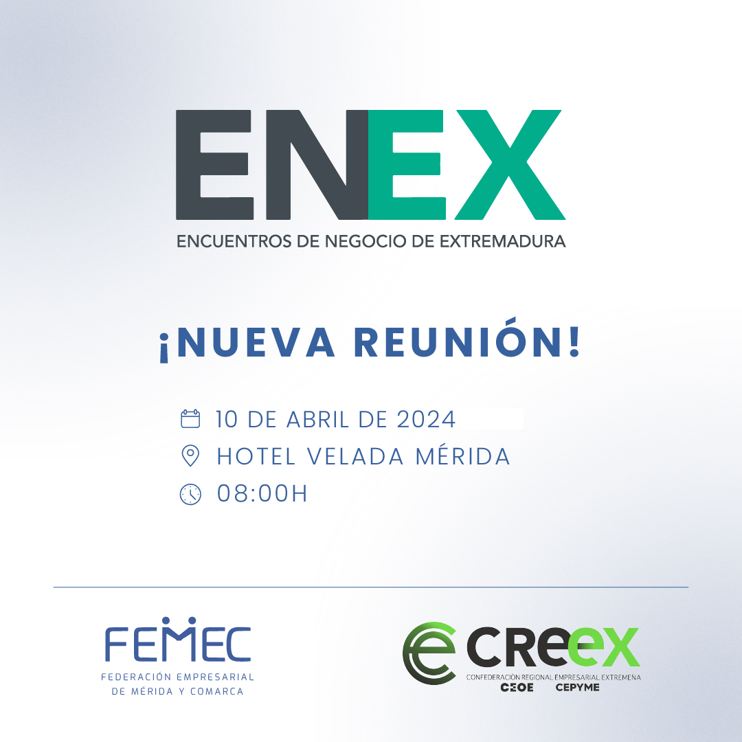 Se acerca la fecha de la nueva edición de los Encuentros de Negocio ENEX que celebramos en Mérida, el miércoles 10 de abril (2024), en el Hotel Velada de 8h de la mañana a 9:30h.